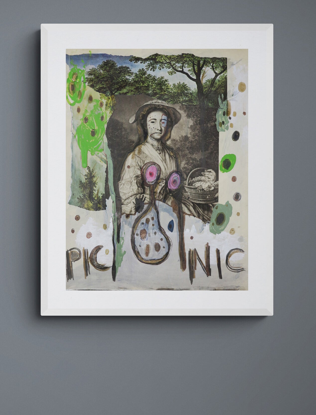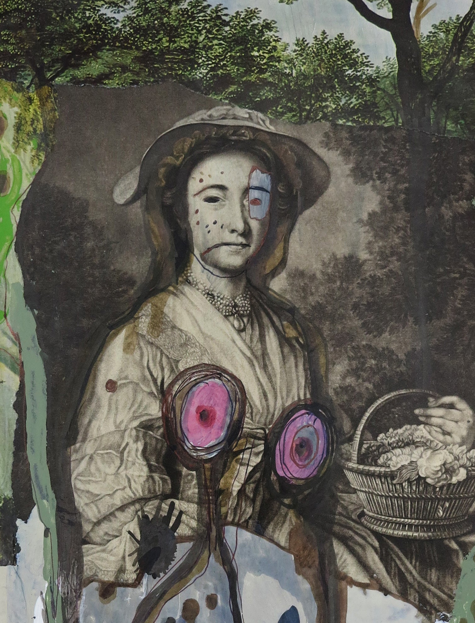 Collage, acrylic, and ink on vintage print (c. 1900s)